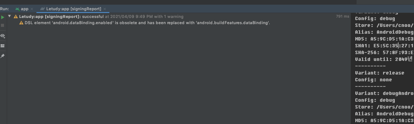 <결과값>cnoo@iMac 28.0.3 % keytool -printcert -jarfile /Users/cnoo/Desktop/release/letudy_v1.0.11.apk