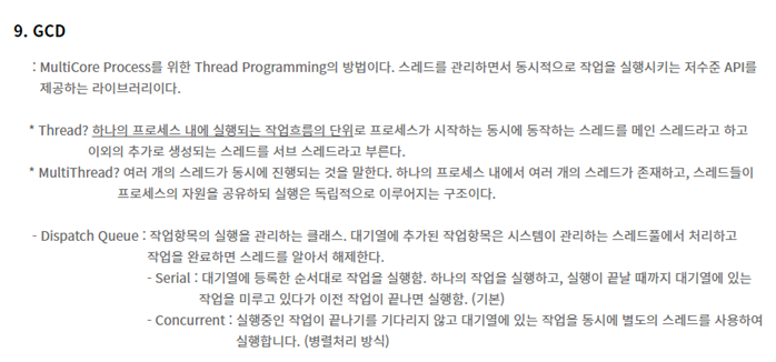 A. GCD - Multicore Process를 위한 Thread programming의 방법이다. 스레드를 관리하면서 동시적으로 작업을 실행시키는 저수준 API를 제공하는 라이브러리이다.