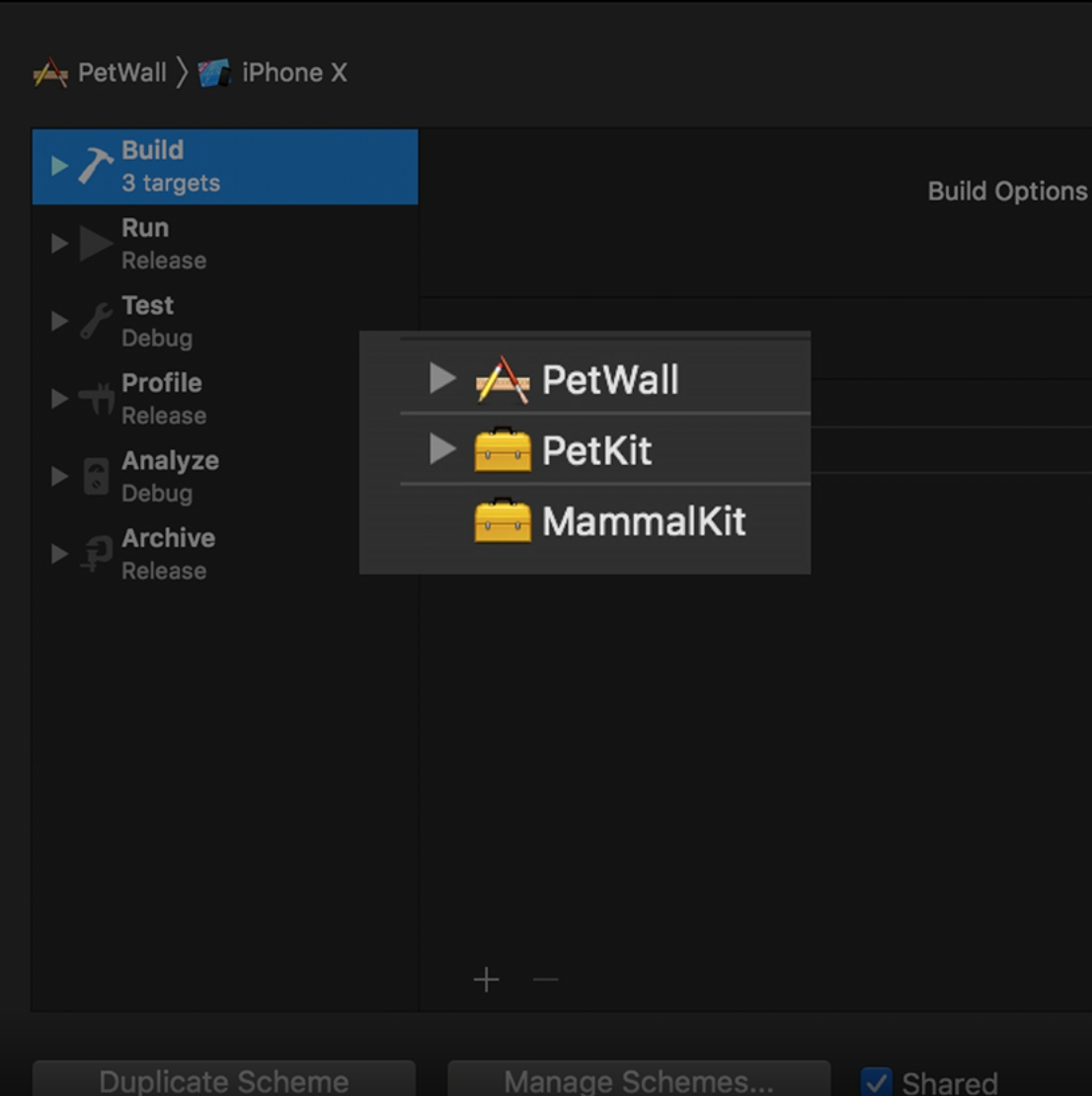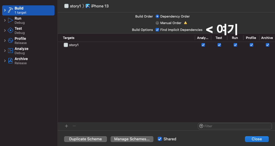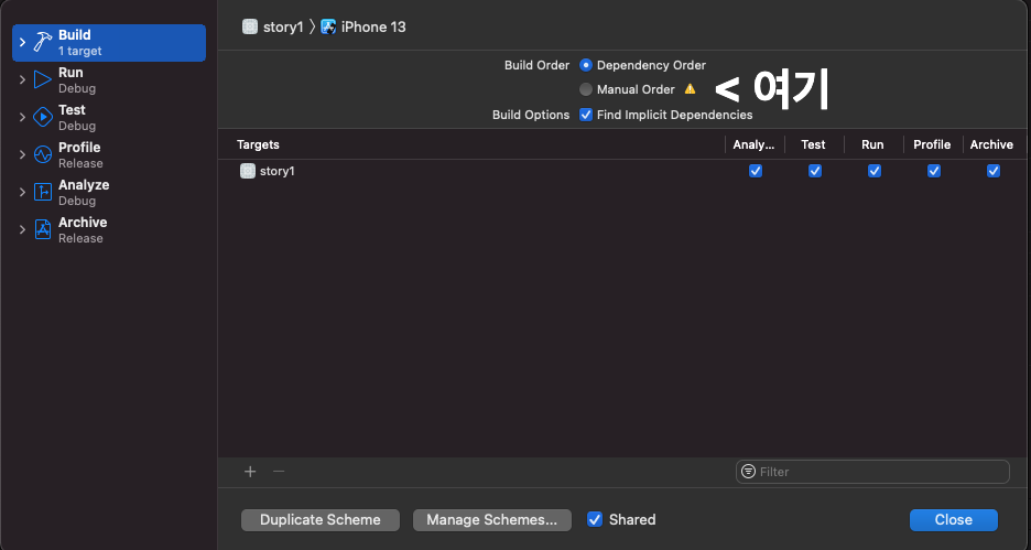 다음으로 스킴 순서 종속성입니다. "Edit Scheme"쪽에서 설정하실 수 있는데요,,