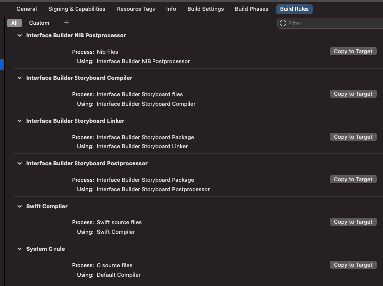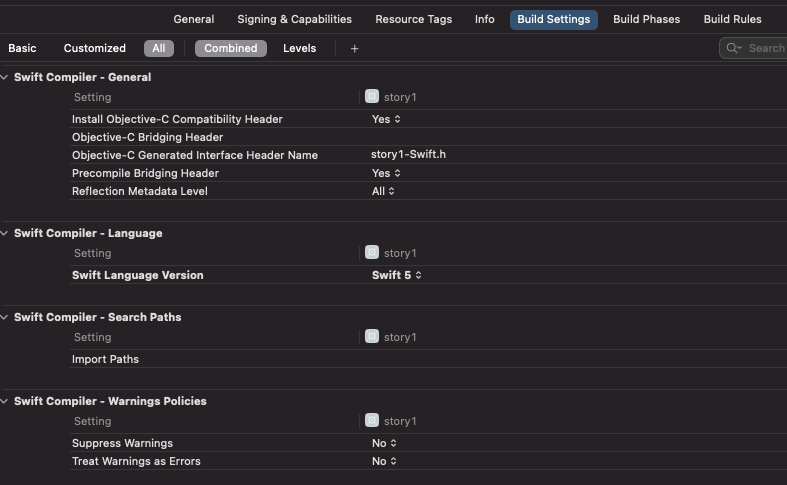 여기있는 설정들인데, 보시면 swift는 뭘로 컴파일하고, C는 뭘로 컴파일하고, Nib, Storyboard는 뭘로 컴파일하고...