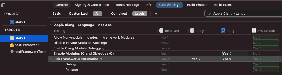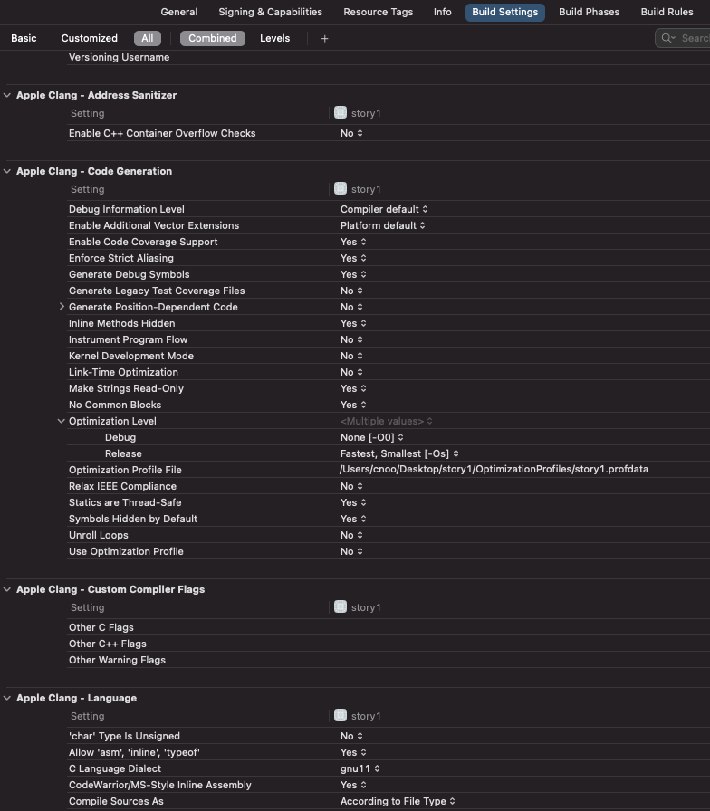 Xcode에 Build Settings에 이 두 컴파일러에 대한 설정이 각각 있는 것을 보실 수 있습니다.