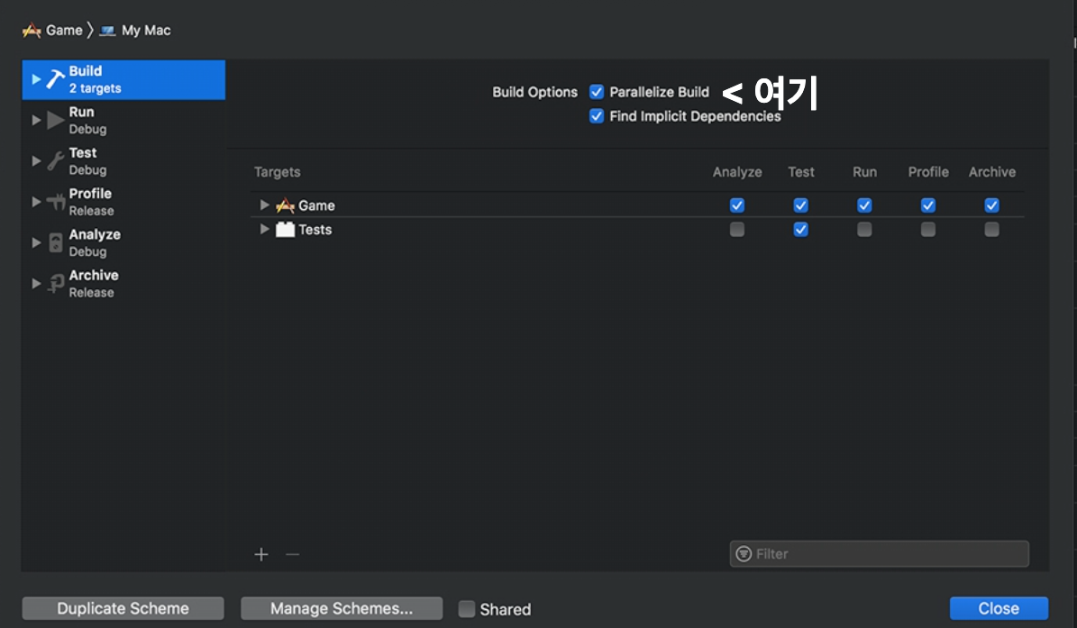 병렬 작업 설정은 Xcode "Edit Scheme"메뉴에서 병렬처리 옵션에 체크해주면 됩니다. (Xcode 13에선 해당 설정이 없네요.. 기본값 활성화로 추측됩니다... )